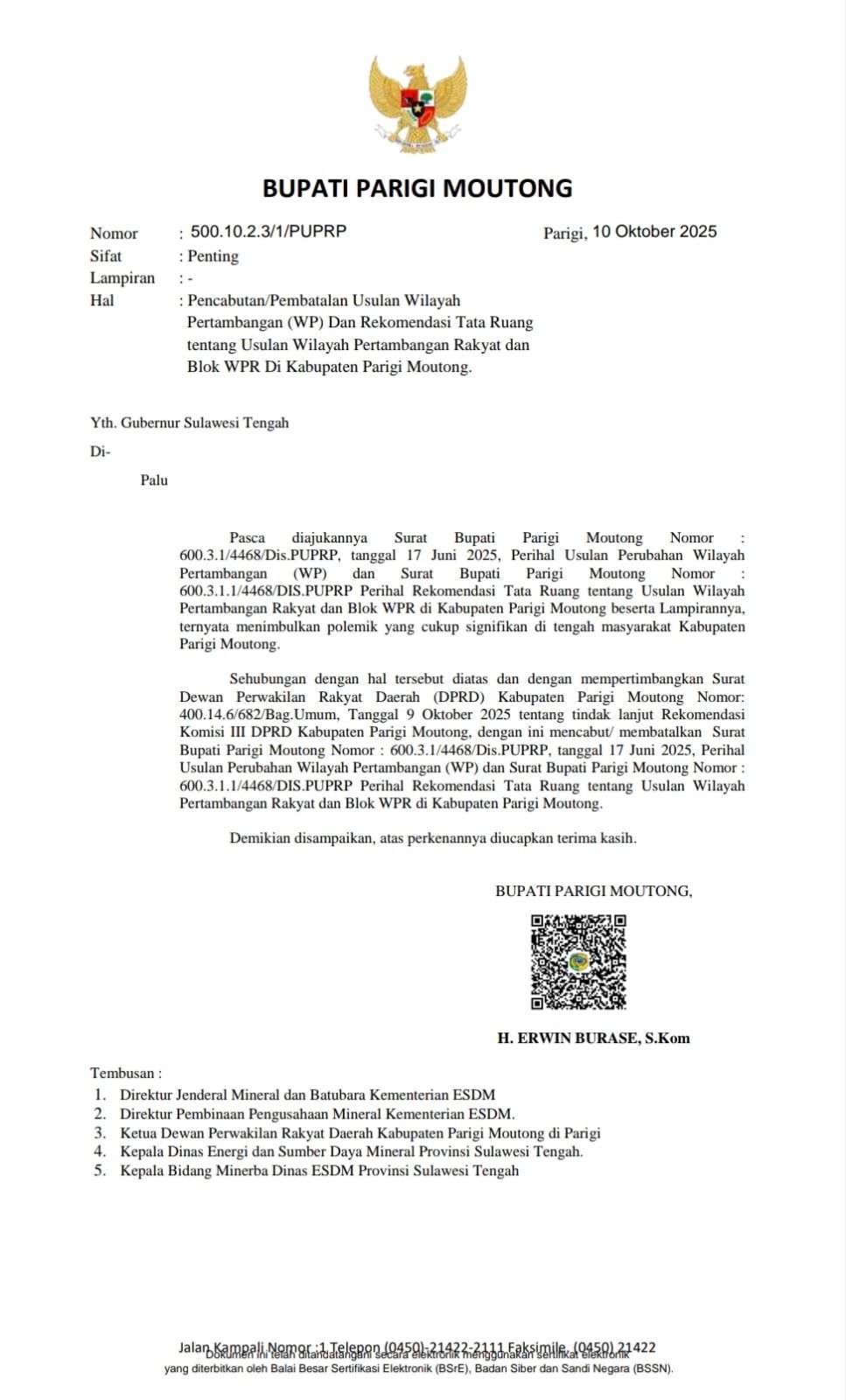 Keputusan tersebut tertuang dalam Surat Bupati Parimo Nomor 500.10.2.3/1/PUPRP, bertanggal 10 Oktober 2025, yang ditujukan kepada Gubernur Sulawesi Tengah di Palu.