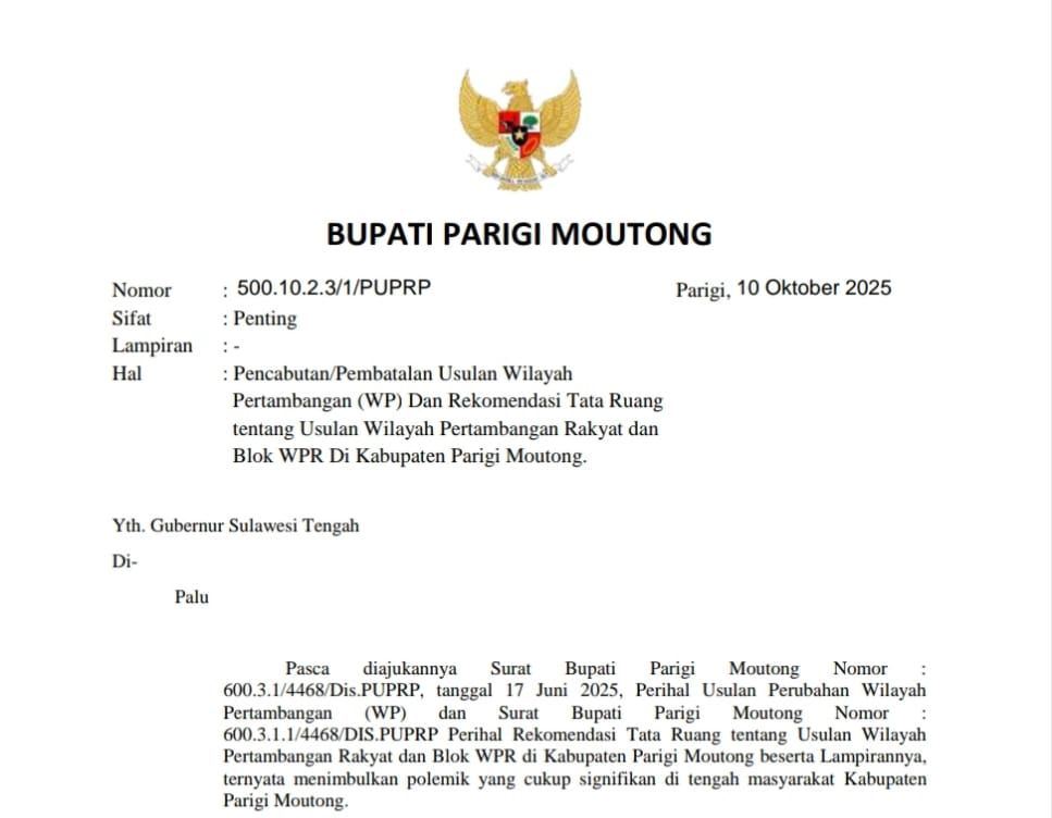 Keputusan tersebut tertuang dalam Surat Bupati Parimo Nomor 500.10.2.3/1/PUPRP, bertanggal 10 Oktober 2025, yang ditujukan kepada Gubernur Sulawesi Tengah di Palu.