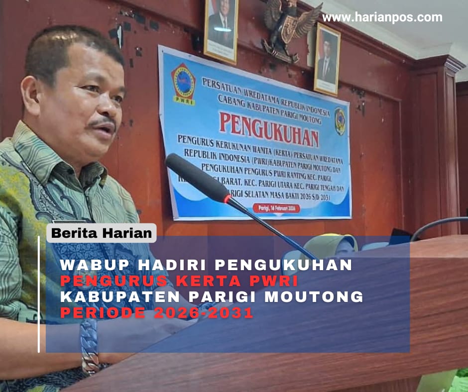 Parigi, Harianpos – Wakil Bupati Parigi Moutong (Parimo) , H. Abdul Sahid, menghadiri pengukuhan Pengurus Kerukunan Wanita (Kerta) Persatuan Wredatama Republik Indonesia (PWRI) Kabupaten Parigi Moutong serta pengukuhan Pengurus Ranting PWRI Kecamatan Parigi, Parigi Barat, Parigi Utara, Parigi Tengah, dan Parigi Selatan masa bakti 2026–2031. Kegiatan tersebut berlangsung di Aula Lantai II Kantor Bupati Parigi Moutong, Senin (16/2/2026).
